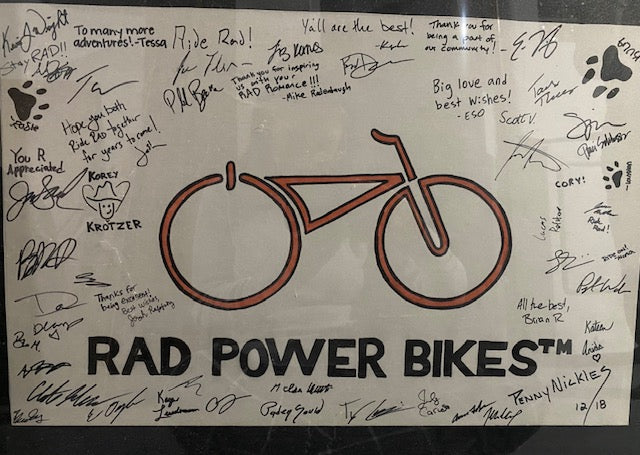 A couple years back, he sent Rad Power Bikes a hand-painted poster of our logo that his mother had made. He told us his and Louise's story and asked the team to autograph it.